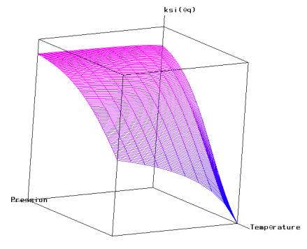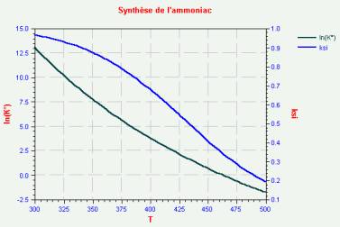 Synthèse de l’ammoniac : tracé de ln(K°) et de xeq en fonction de la température ainsi que d’une surface 3D rendement en fonction de la pression et de la température.