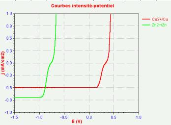 Allure des courbes intensité-potentiel pour le système cuivre/zinc.